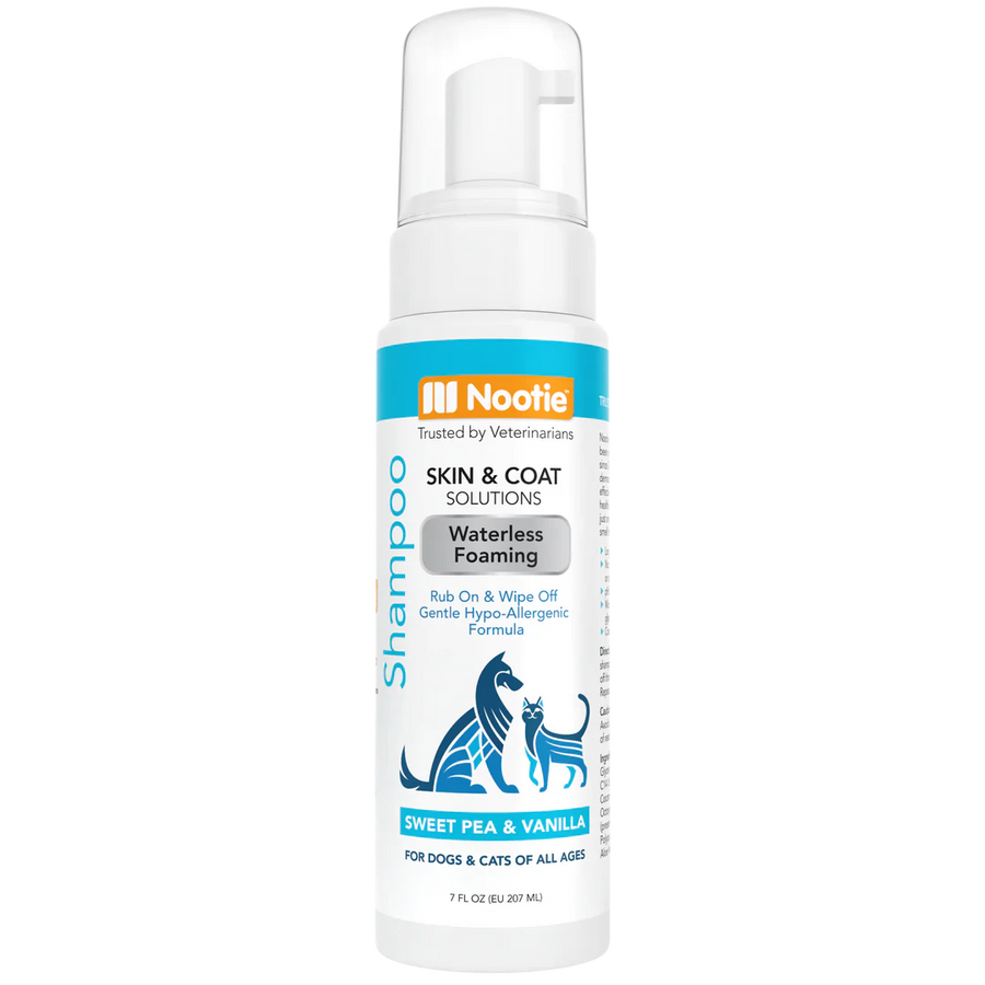 Nootie Waterless Foaming Shampoo takes the stress & mess out of bathing with our easy rub-on and wipe-off formula. Freshen up your pet without the water-splashing mess. This gentle hypoallergenic foaming shampoo is safe to use on dogs, cats and puppies, leaving their coat clean, soft and smelling great.