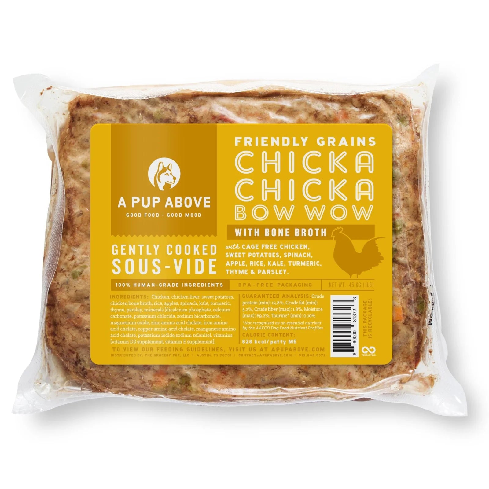 - Chicken Recipe: Chicken, chicken liver, sweet potatoes, chicken bone broth, rice, apples, spinach, kale, turmeric, thyme, parsley, APA nutrient mix