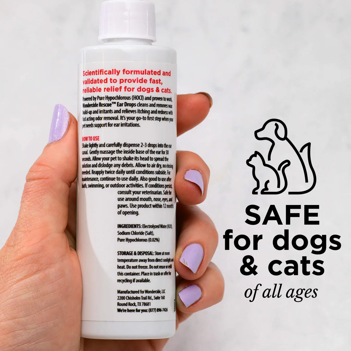 Gently clean ears and calm irritation with RESCUE™ Ear Drops. This alcohol-free formula helps remove wax, odor, and debris while soothing itching and redness. Powered by Pure Hypochlorous and safe for daily use. Flexible silicone tip makes application easy.