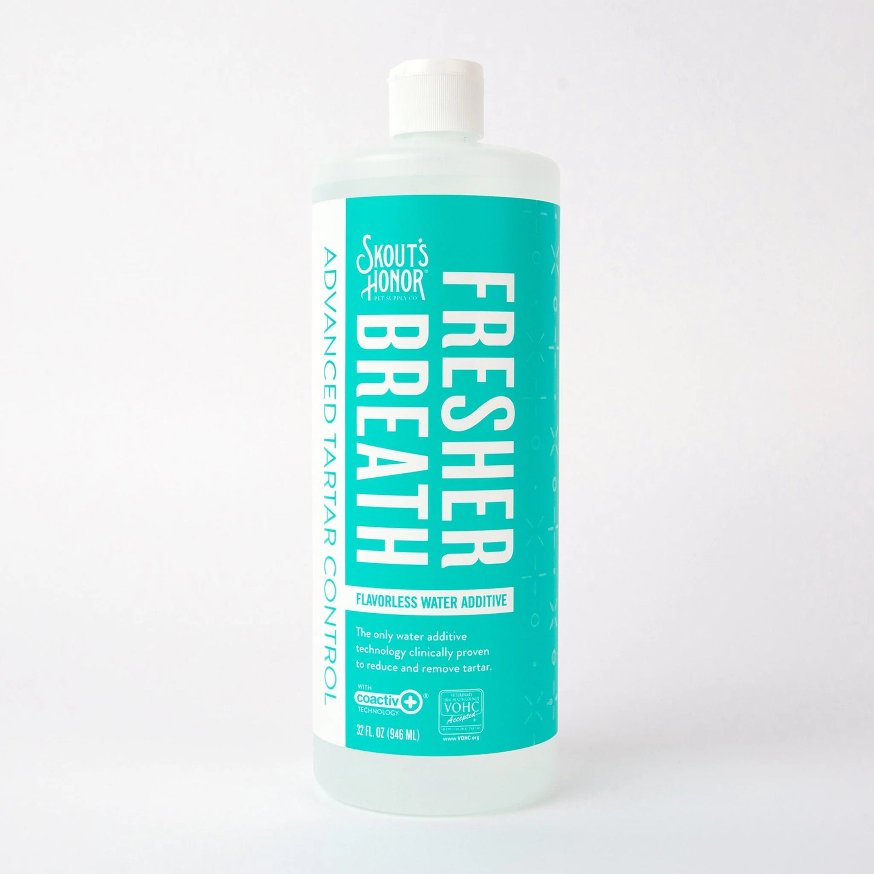 Skout’s Honor Fresher Breath Water Additive is the simplest way to start your pet’s daily oral care routine—no brushing required. Powered by coactiv+® technology, this is the only VOHC-Accepted water additive for tartar control, and is clinically proven to reduce and break down tartar. Just add it to their water bowl daily to freshen breath and clean teeth.